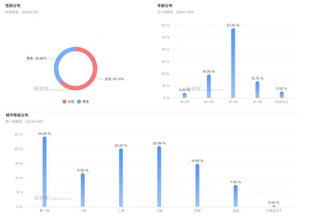 達多多數(shù)據(jù)顯示,與輝同行直播間的用戶畫像,以24歲—50歲的女性消費者為主,其中31歲—40歲用戶群體占比為57%,是直播間消費的“基本盤”。從城市等級分布上看,新一線城市用戶占比約為24.29%,二線城市和三線城市用戶分為占到20.2%以及20.99%!罢赡改铩钡闹覍崜碥O,讓與輝同行交出了不錯的答卷。