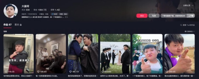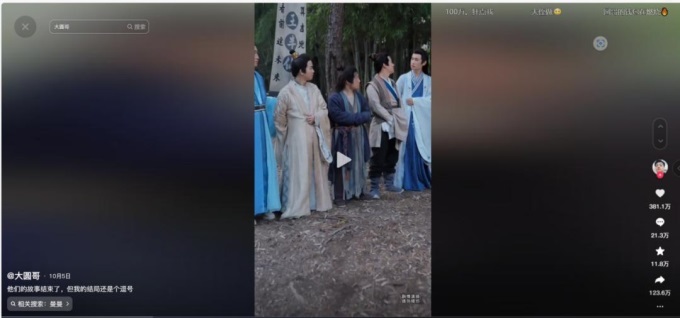 但@大圓哥高點(diǎn)贊視頻創(chuàng)作成本相對(duì)較高。如《他們的故事結(jié)束了,但我結(jié)局還是個(gè)逗號(hào)》,團(tuán)隊(duì)從河南商丘到浙江橫店,來(lái)回差旅費(fèi)用、橫店拍攝期間場(chǎng)地、化妝、武指費(fèi)用、幾秒的無(wú)人機(jī)鏡頭拍攝費(fèi)用等等,預(yù)估至少在20萬(wàn)。