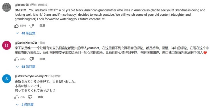 在YouTube平臺(tái)上,不同國(guó)家的網(wǎng)友用不同的語(yǔ)言,表達(dá)對(duì)李子柒的愛(ài)和支持。韓國(guó)網(wǎng)友表示:眼淚都出來(lái)了,等待了兩年,終于見(jiàn)到姐姐的影像。希望未來(lái)的十年二十年,我們一直一起變老。