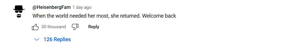 在世界最需要她的時(shí)候、她回來(lái)了,歡迎回來(lái)。這條評(píng)論在引發(fā)全球各國(guó)網(wǎng)友共鳴的同時(shí),點(diǎn)贊量高達(dá)3萬(wàn)+。