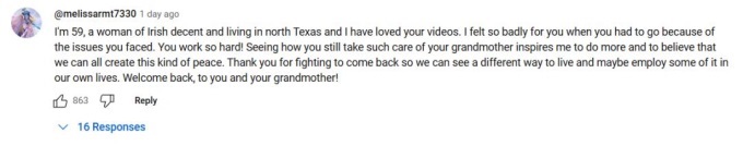 愛(ài)爾蘭網(wǎng)友表示:我非常喜歡你的視頻。當(dāng)你因?yàn)橛龅降膯?wèn)題不得不離開(kāi)時(shí),我為你感到難過(guò)。你真的很努力!看到你仍然如此用心地照顧你的奶奶,激勵(lì)我去做更多的事情,并讓我相信我們都可以創(chuàng)造這種平靜的生活。