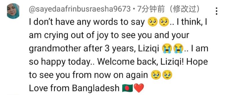 孟加拉國(guó)網(wǎng)友表示:我不知道該說(shuō)什么了,我想我是因?yàn)楦吲d哭了,時(shí)隔三年再次見(jiàn)到你和你的奶奶,今天我真的很開(kāi)心,歡迎回來(lái),李子柒!希望從現(xiàn)在開(kāi)始能再次見(jiàn)到你。