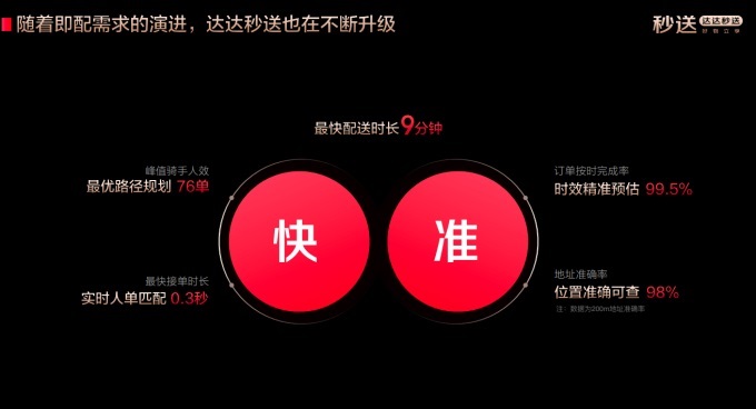 基于即配需求的不斷演進(jìn),達(dá)達(dá)秒送的即配服務(wù)也在不斷升級,在最快配送時長9分鐘基礎(chǔ)上進(jìn)一步提升精準(zhǔn)度,包括時效精準(zhǔn)預(yù)估,訂單按時完成率高達(dá)99.5%;地址準(zhǔn)確率高達(dá)98%;實時人單匹配快至0.3秒,真正做到毫秒級接單。