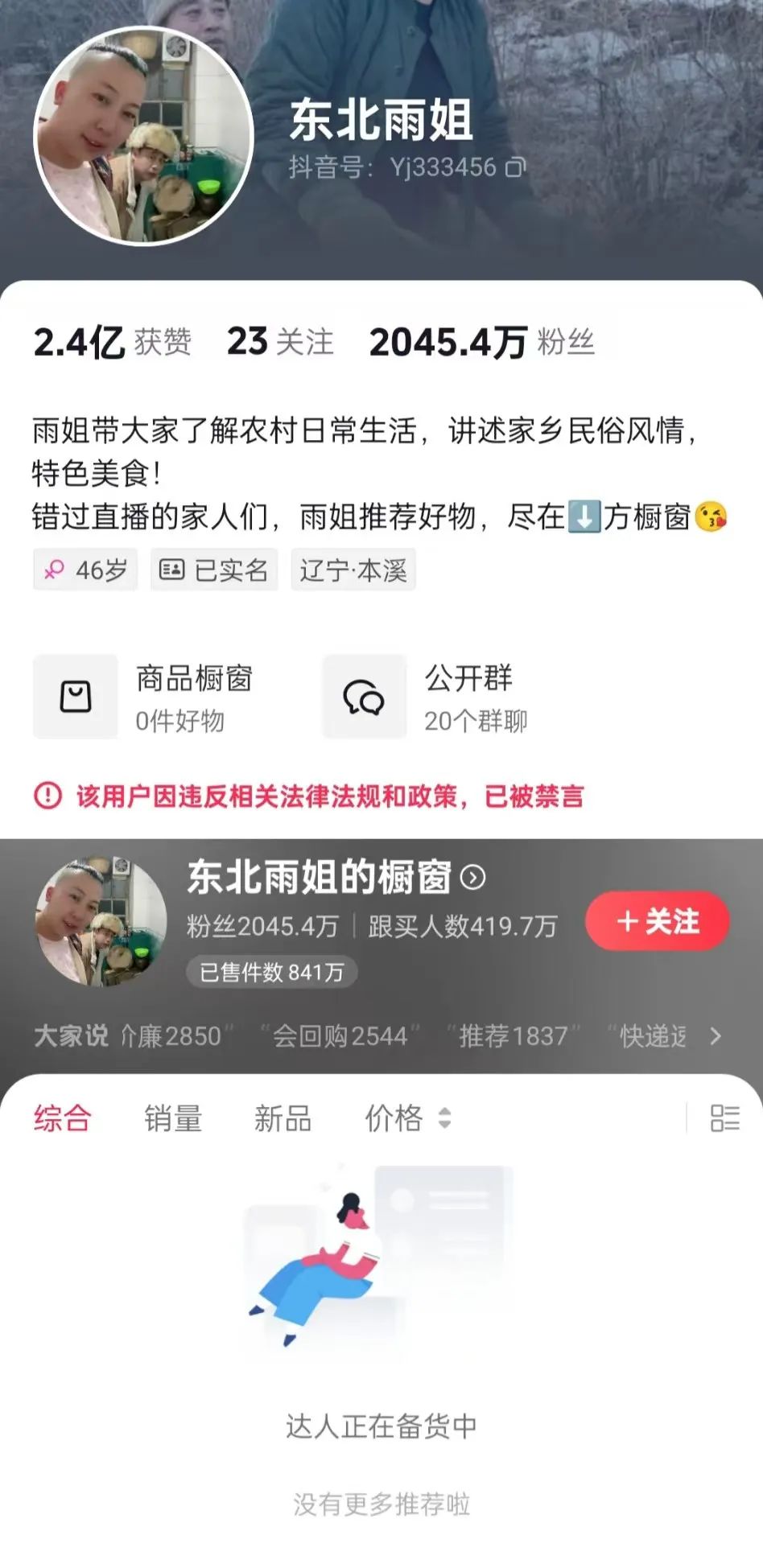 東北雨姐被禁言 櫥窗清空 圖源:抖音
