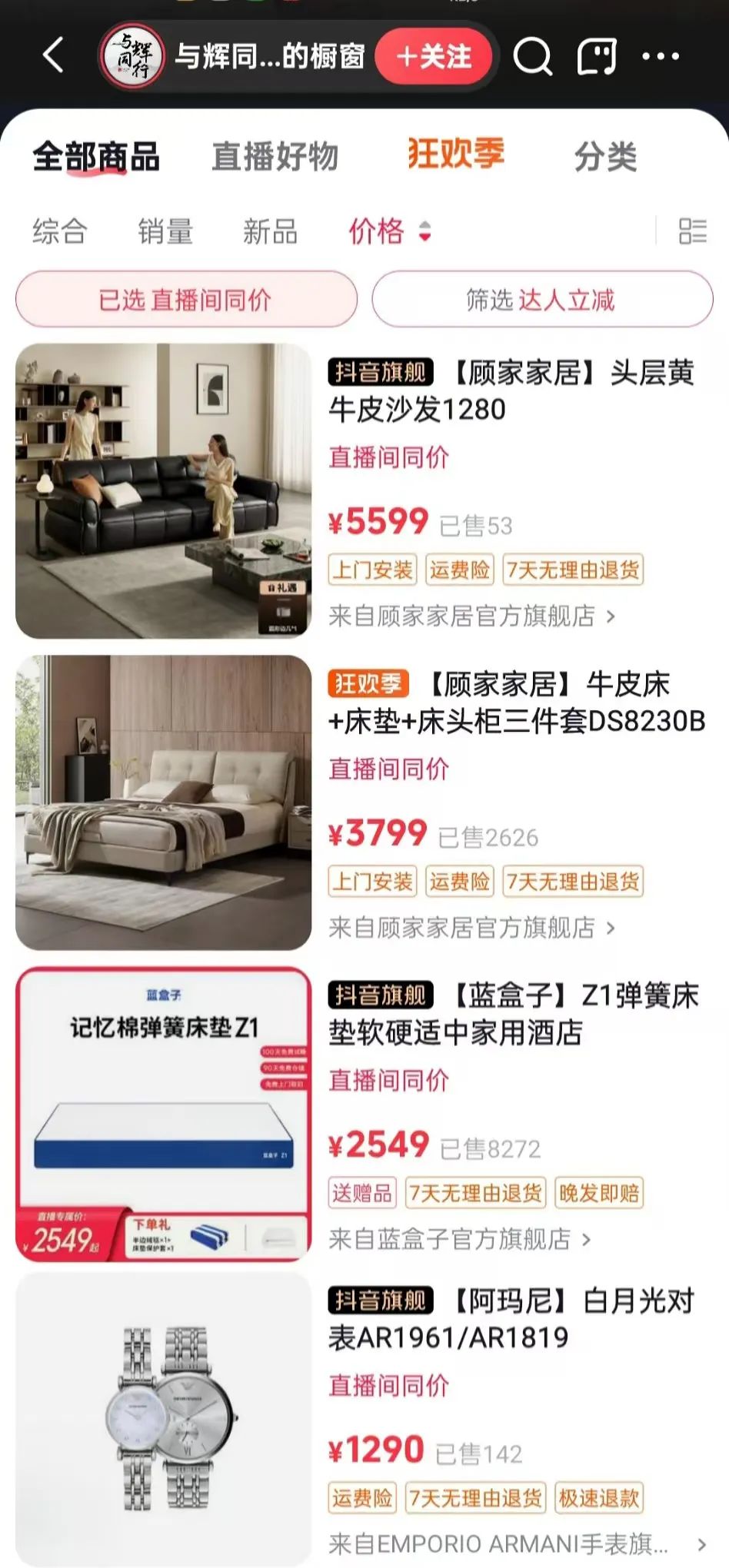 在與輝同行的抖音櫥窗中,與直播間同價(jià)、價(jià)格上千的商品也并不少,如5599元的牛皮沙發(fā)、2549元的彈簧床墊、1290元的阿瑪尼對(duì)表等。