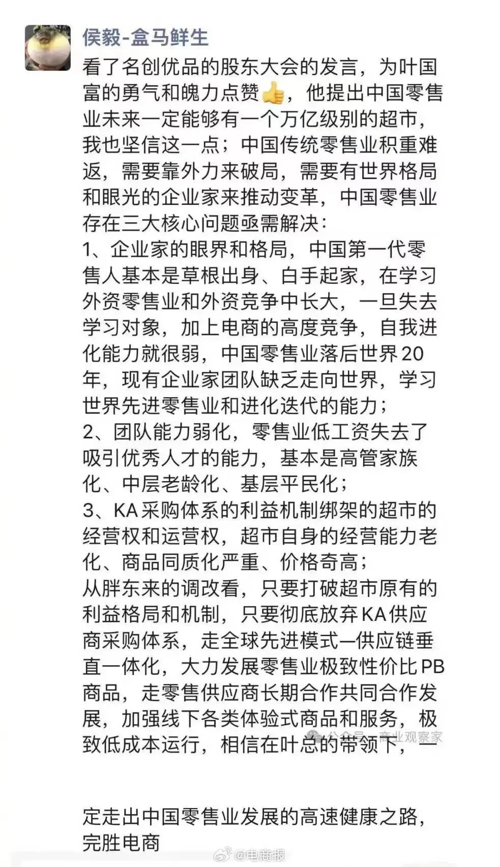 今年9月,在名創(chuàng)優(yōu)品公布收購永輝超市消息之際,侯毅發(fā)表朋友圈表示,只要打破超市原有的利益格局和機制,徹底放棄KA供應(yīng)商采購體系,走全球先進的供應(yīng)鏈垂直一體化模式,中國零售業(yè)就能走出高速健康之路,完勝電商。