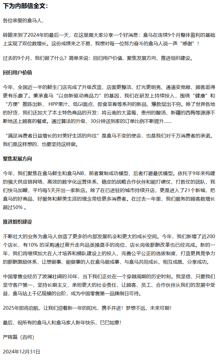 據(jù)界面新聞獨家消息,嚴筱磊在近日發(fā)布的內(nèi)部信中透露了一個振奮人心的好消息:在連續(xù)九個月整體盈利的基礎(chǔ)上,盒馬實現(xiàn)了雙位數(shù)增長。