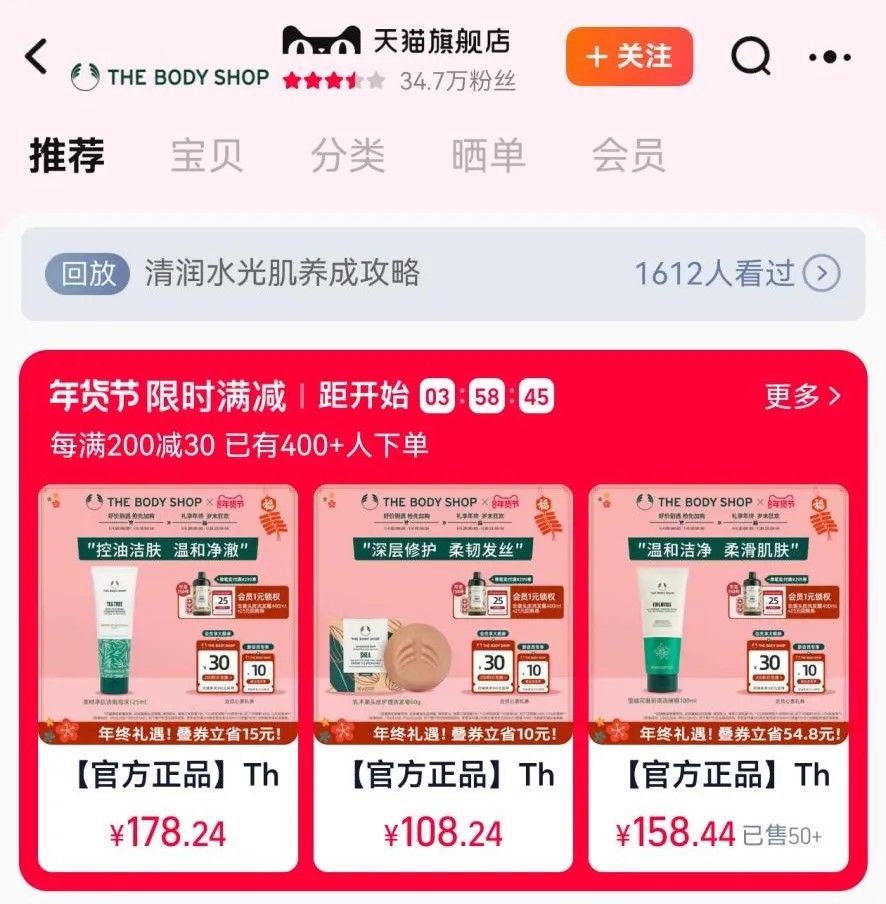 青眼調(diào)查發(fā)現(xiàn),截至發(fā)稿時,The Body Shop天貓海外旗艦店和抖音官方旗艦店仍在正常營業(yè)中,分別擁有粉絲34.7萬和1.6萬。不過,抖音賬號“美體小鋪The body shop官方旗艦店”自2024年2月后便停止了更新,The Body Shop天貓海外旗艦店則自2024年6月后也暫停了店鋪直播。