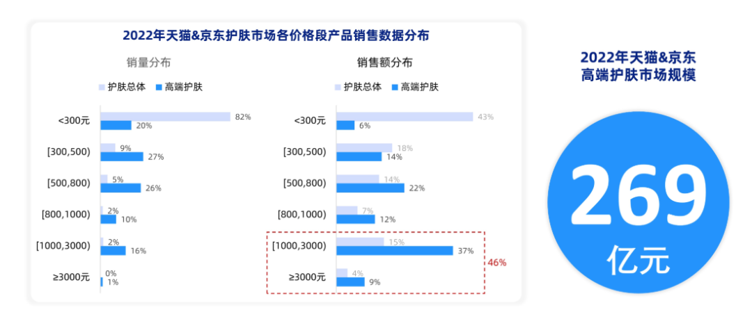 根據(jù)數(shù)說故事數(shù)據(jù),2022年天貓&京東高端護膚市場規(guī)模達269億元,千元以上商品貢獻了近半銷售額,高端護膚市場呈國際大牌低集中寡占競爭格局。