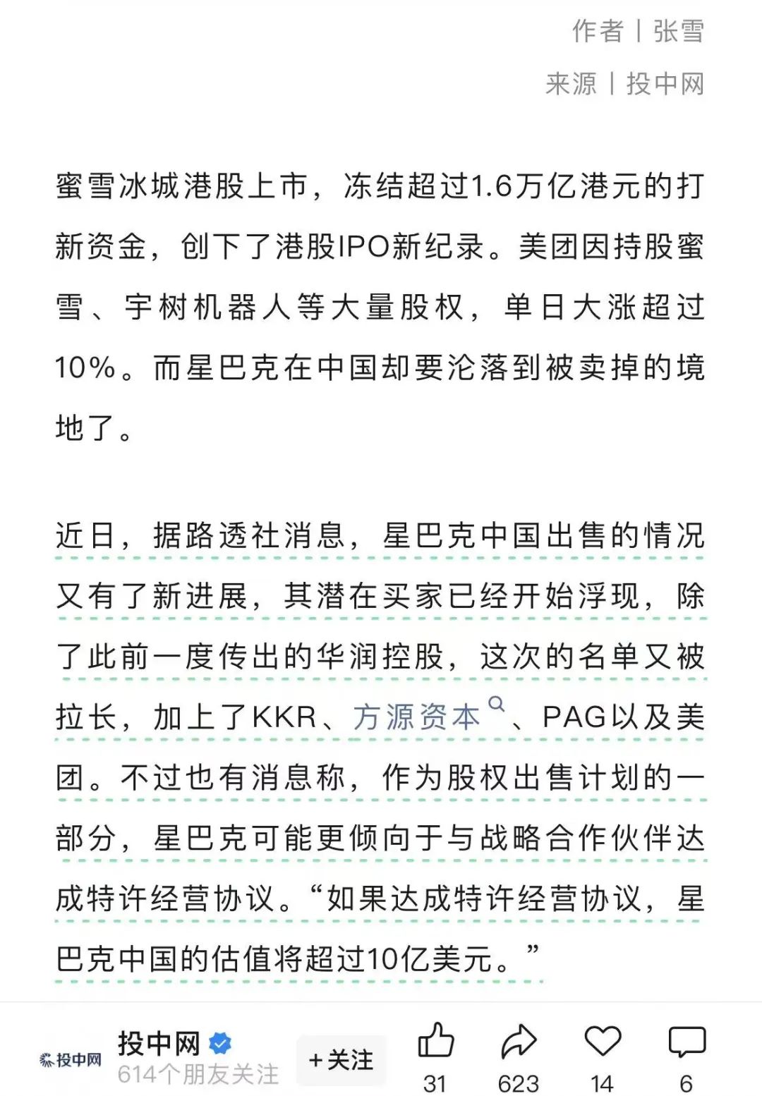 2月26日,投中網(wǎng)援引路透社報(bào)道稱(chēng),私募機(jī)構(gòu)KKR、方源資本FountainVest、太盟投資集團(tuán)PAG等機(jī)構(gòu)有意向收購(gòu)星巴克中國(guó)股份。同時(shí),華潤(rùn)集團(tuán)與美團(tuán)也作為潛在買(mǎi)家,與星巴克方面進(jìn)行了初步的接洽。