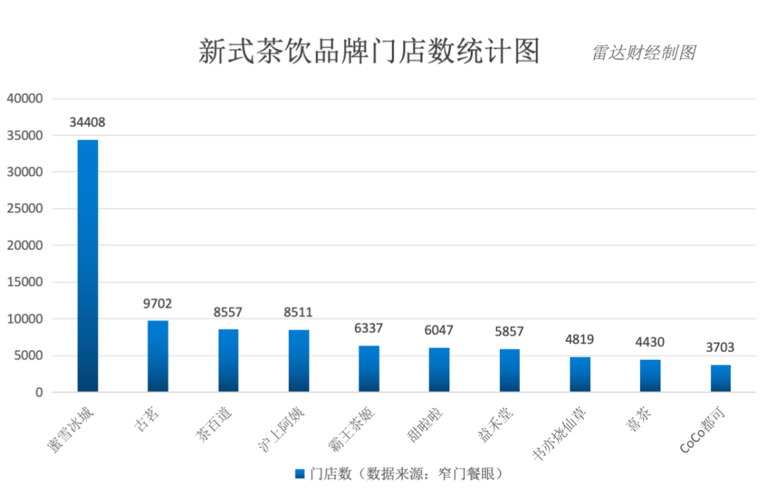 根據(jù)窄門餐眼數(shù)據(jù)顯示,目前國內(nèi)門店數(shù)排在前十的新式茶飲玩家,分別為蜜雪冰城、古茗、茶百道、滬上阿姨、霸王茶姬、甜啦啦、益禾堂、書亦燒仙草、喜茶和CoCo都可。