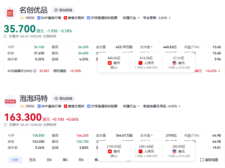 名創(chuàng)優(yōu)品和泡泡瑪特的最新市值