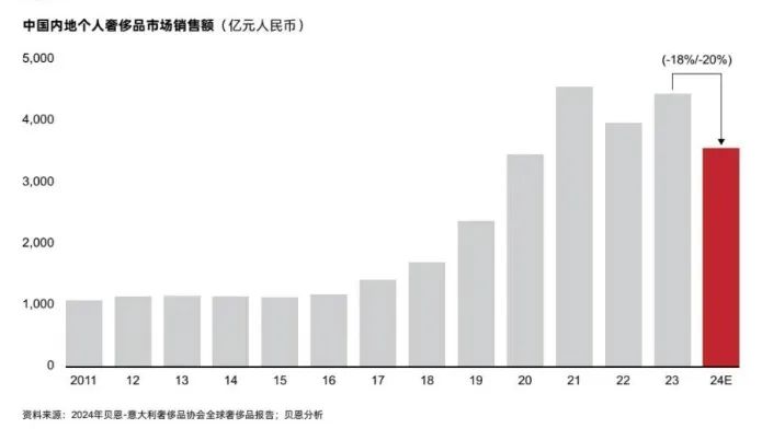 除此之外,2024年中國內(nèi)地高端消費(fèi)市場規(guī)模同比下滑2%至1.63萬億元,其中個人奢侈品市場銷售額預(yù)計(jì)下降18%-20%。