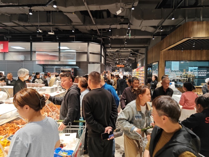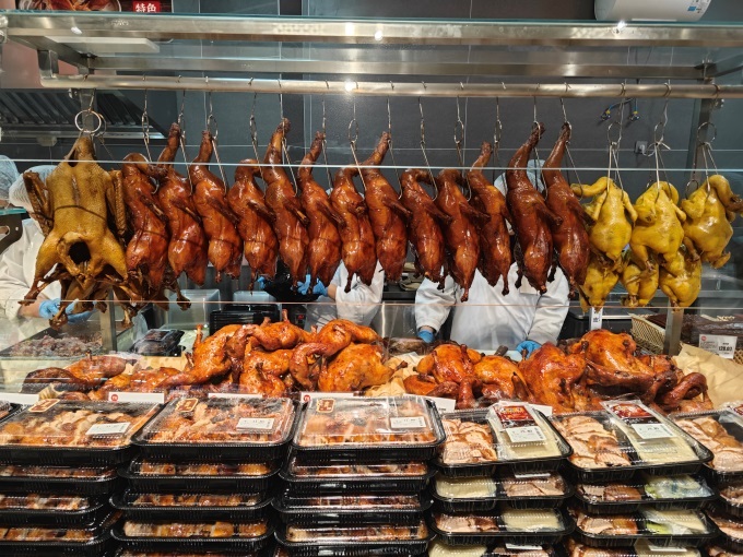 在保留藤橋熏雞、鴨舌等非遺美食基礎(chǔ)上,冷藏區(qū)革新尤為突出,新增快手菜專區(qū),日式肥牛壽喜鍋、泰式冬陰功海鮮燴等預(yù)制菜與手工鮮蝦云吞、黑松露菌菇餃等高端面點(diǎn)組成"五分鐘美食矩陣"。熟食區(qū)胖東來(lái)同款小甜腸、特色牛肉條、現(xiàn)鹵小龍蝦等單品單日補(bǔ)貨多次。