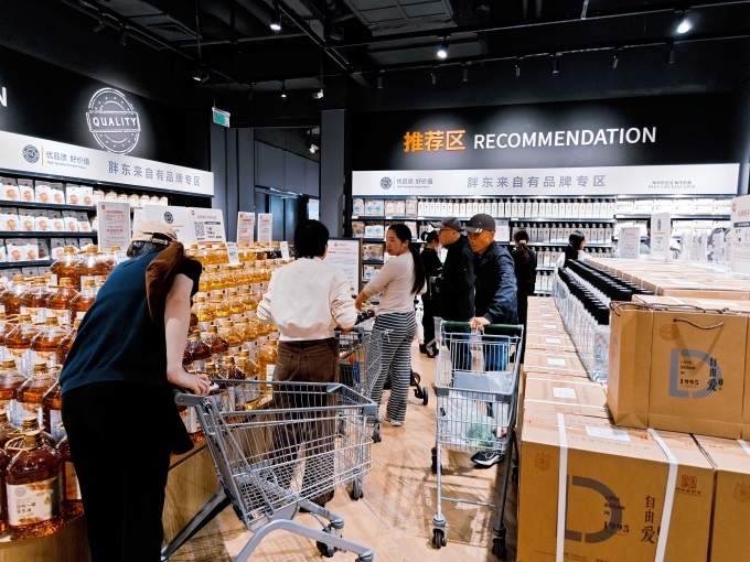 胖東來(lái)基因的深度植入在商品端表現(xiàn)亮眼,特別設(shè)立的胖東來(lái)自有品牌專區(qū),DL精釀啤酒、DL水蜜桃汁、DL橙汁等飲品與DL多效洗衣液、DL壓榨一級(jí)花生油等日用品組成品質(zhì)生活矩陣。雖非首次引入胖東來(lái)爆款商品,溫州消費(fèi)者依舊熱情高漲,專區(qū)商品開(kāi)業(yè)僅1小時(shí)便多次補(bǔ)貨。