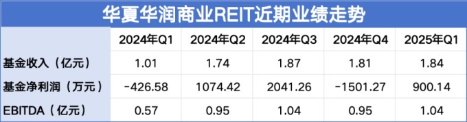 從最新披露的數(shù)據(jù)來看,2025年一季度,華夏華潤商業(yè)REIT的基金收入為1.84億元,完成度為101.04%,凈利潤也扭虧為盈,達(dá)到900.14萬元,基金EBITDA為1.04億元,預(yù)測完成度為109.06%。
