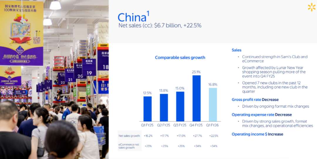 中國(guó)市場(chǎng)的優(yōu)異表現(xiàn),也正是撬動(dòng)沃爾瑪增長(zhǎng)的火車頭。沃爾瑪2026財(cái)年一季報(bào)顯示,截至2025年4月30日的單季內(nèi),沃爾瑪國(guó)際市場(chǎng)會(huì)員費(fèi)收入增長(zhǎng)22%,由山姆中國(guó)引領(lǐng)增長(zhǎng),若想持續(xù)提升會(huì)員費(fèi)收入,就需要繼續(xù)擴(kuò)張門店規(guī)模。