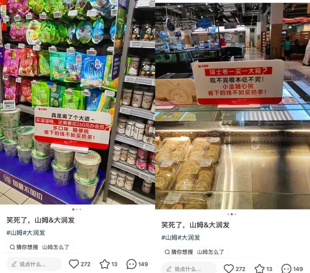 曾經(jīng)的“超市之王”大潤(rùn)發(fā)也沒(méi)有錯(cuò)過(guò)流量。有消費(fèi)者在逛大潤(rùn)發(fā)的時(shí)候,溜溜梅、瑞士卷等山姆同款上有了新的商品標(biāo)簽:“真是離了個(gè)大譜,買溜溜梅,還需要花260元辦會(huì)員?”