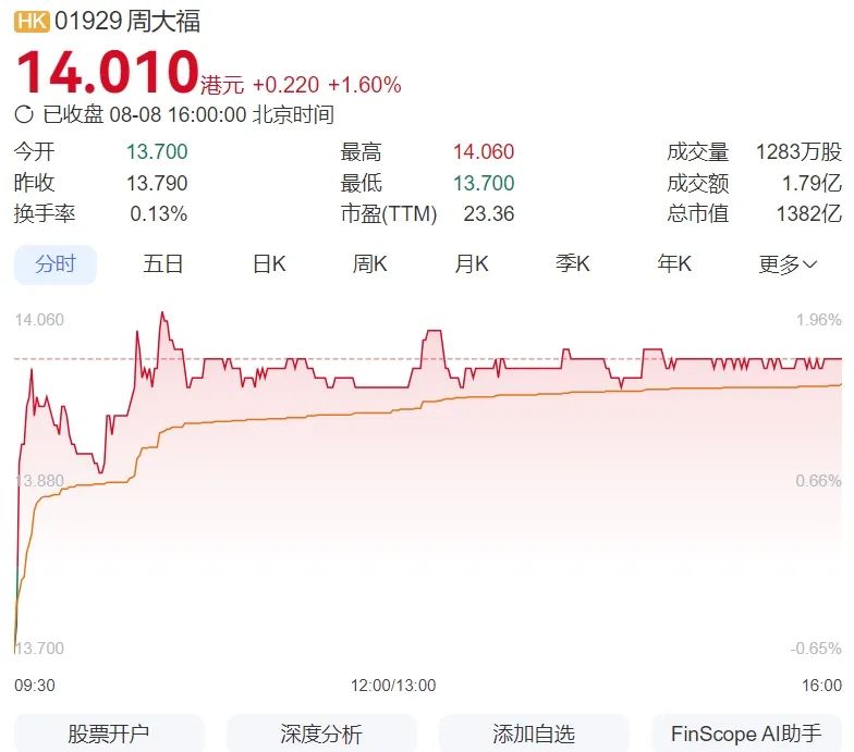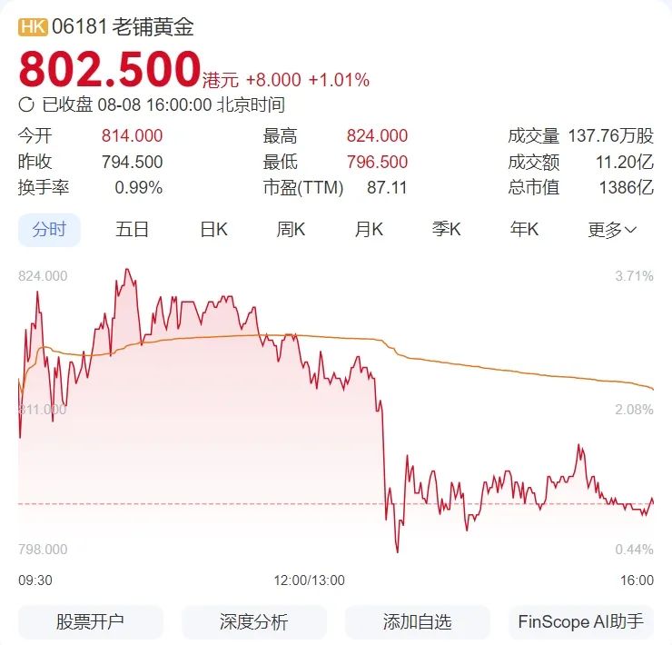 老鋪黃金門店少,但是店效超高,也讓其股票被市場看好,截至8月8日收盤,老鋪黃金股價為802.5港元/股,市值1386億港元。同日,周大福股價為14.01港元/股,市值1382億港元。
