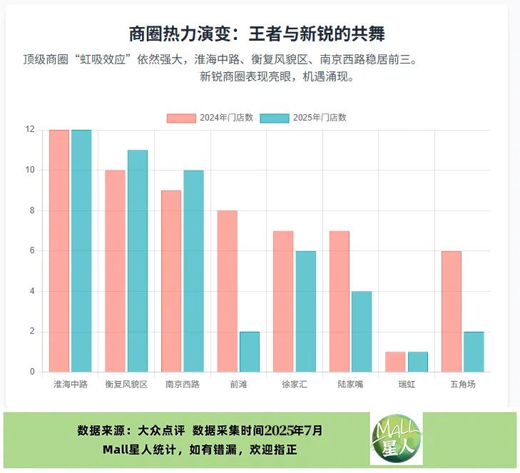 徐家匯、五角場等商圈表現(xiàn)亮眼,兩年均有大量門店上榜,證明了其作為城市副中心和區(qū)域商業(yè)核心的強大號召力。