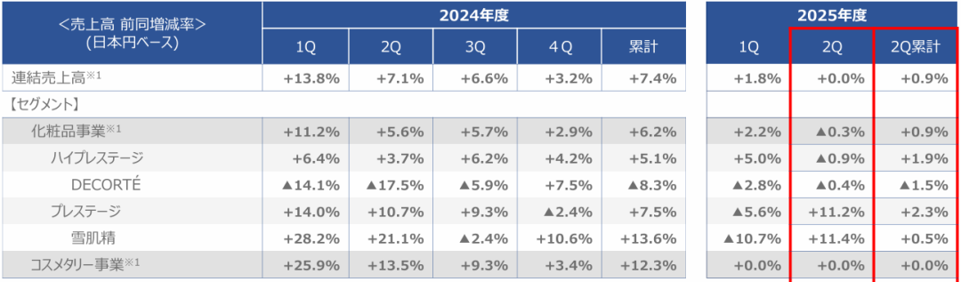 另一日妝巨頭高絲在細(xì)分品牌上表現(xiàn)與花王大漲態(tài)勢不同,其高聲望品牌類別在2025年Q2銷售額下滑0.9%,旗下核心品牌黛珂2025年Q2、上半年分別下滑0.4%、1.5%,高附加值化妝品下的雪肌精分別增長11.4%、0.5%。