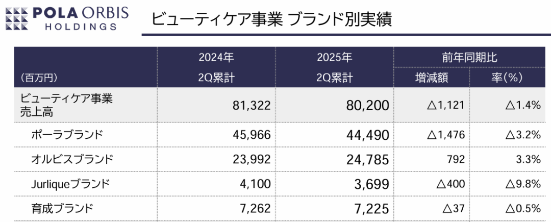 據(jù)財(cái)報(bào)顯示,僅除ORBIS銷售額同比增長3.3%外,其余品牌均為下滑,尤其主品牌POLA在2025上半年較去年同期銷售額已減少14.76億日元(約合人民幣7202.88萬元),比整個(gè)美容護(hù)理業(yè)務(wù)銷售減額還要高,且財(cái)報(bào)透露,POLA銷售額和營業(yè)利潤均低于去年。