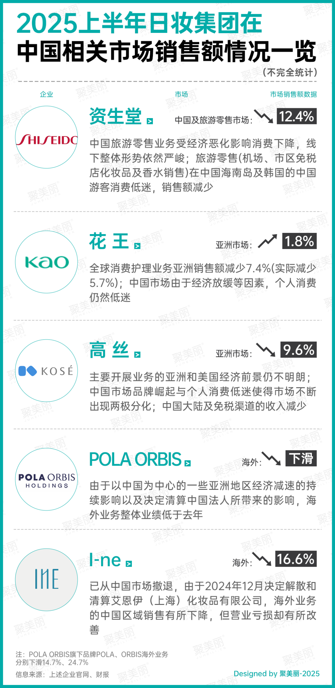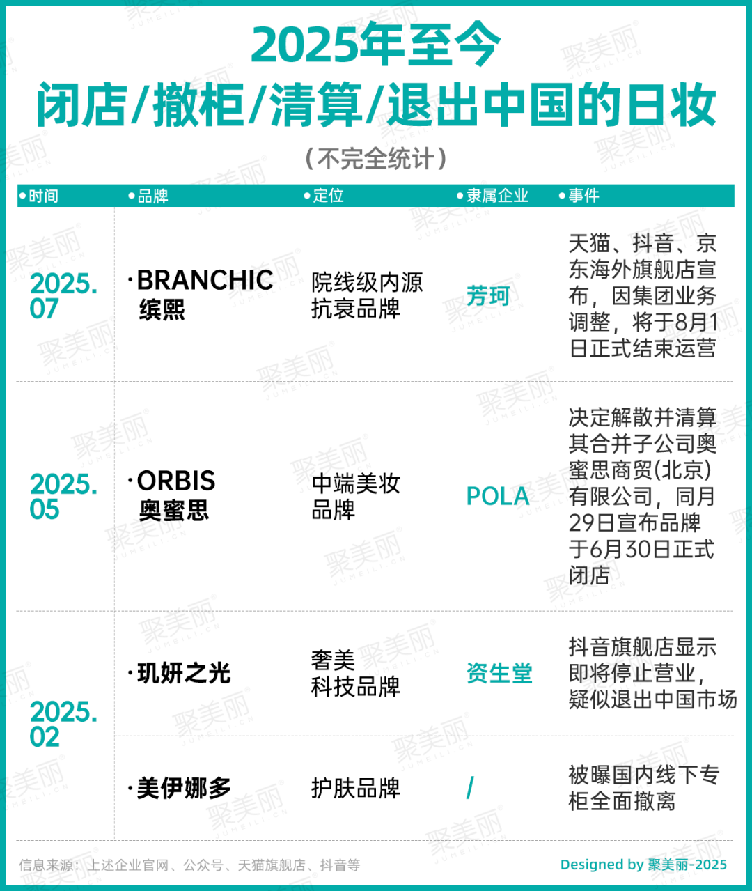4、受中國市場拖累,日妝在包括中國市場在內(nèi)相關(guān)市場下滑占多數(shù),時(shí)至2025年,撤退、清算、閉店動(dòng)向仍不斷;