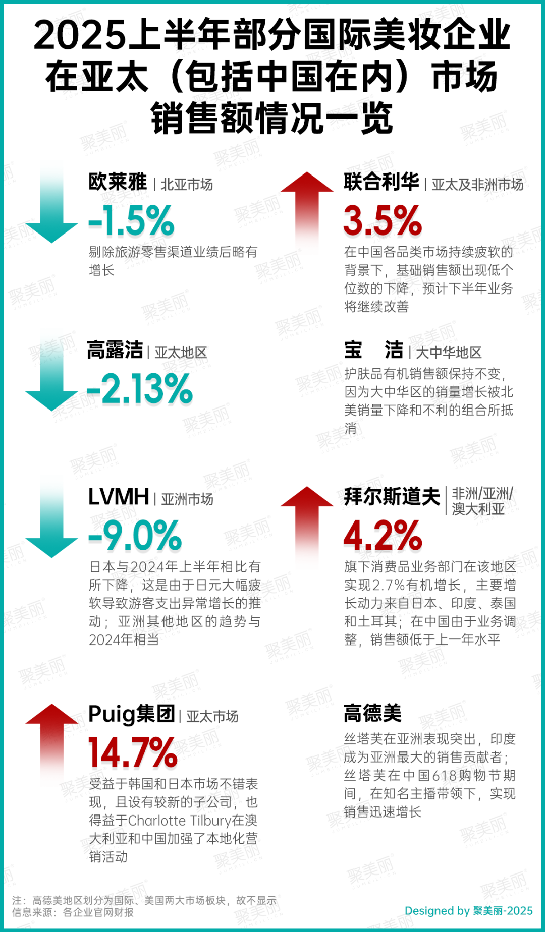 當(dāng)然,在過“苦日子”的也不全然是日妝企業(yè),放眼國際美妝集團(tuán),也有不少因中國旅游零售渠道的疲軟而承壓,在亞太(包括中國在內(nèi))市場亦不容樂觀,2025年的難在銷售額業(yè)績上分明體現(xiàn),作為全球TOP1的歐萊雅,其北亞市場銷售額下跌1.5%,高露潔、LVMH集團(tuán)分別下跌2.13%、9.0%。