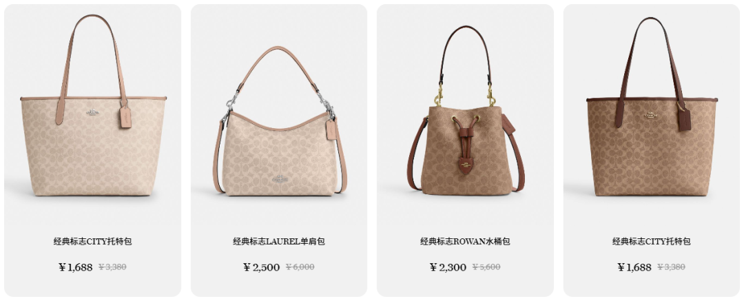 即便是社媒平臺上經(jīng)常被盤點(diǎn)的“Coach里好看又可以背一輩子的包包”,例如經(jīng)典的City托特包、Laurel單肩包、Rotvan水桶包等,在官網(wǎng)奧萊中已經(jīng)打出4-5折,最高價不超過2500元;但在其他促銷活動和折扣平臺上,價格還可下降,甚至來到三位數(shù)的中低段。