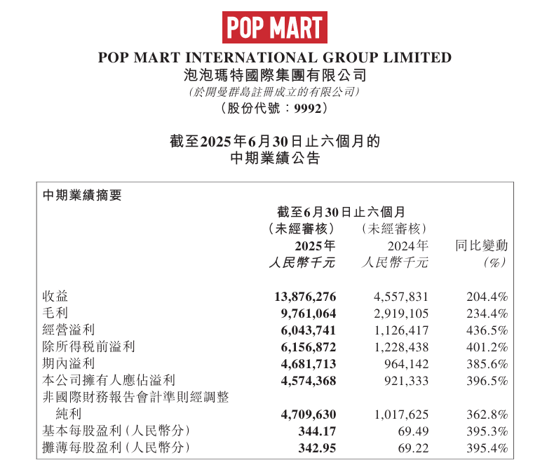 8月19日,泡泡瑪特披露2025年中期業(yè)績。財報顯示,上半年泡泡瑪特營收為138.8億元,同比增長204.4%,經(jīng)調整凈利潤為47.1億元,同比增長362.8%。上半年公司毛利率為70.3%,同比提升了6.3個百分點,多項數(shù)據(jù)創(chuàng)下歷史新高。