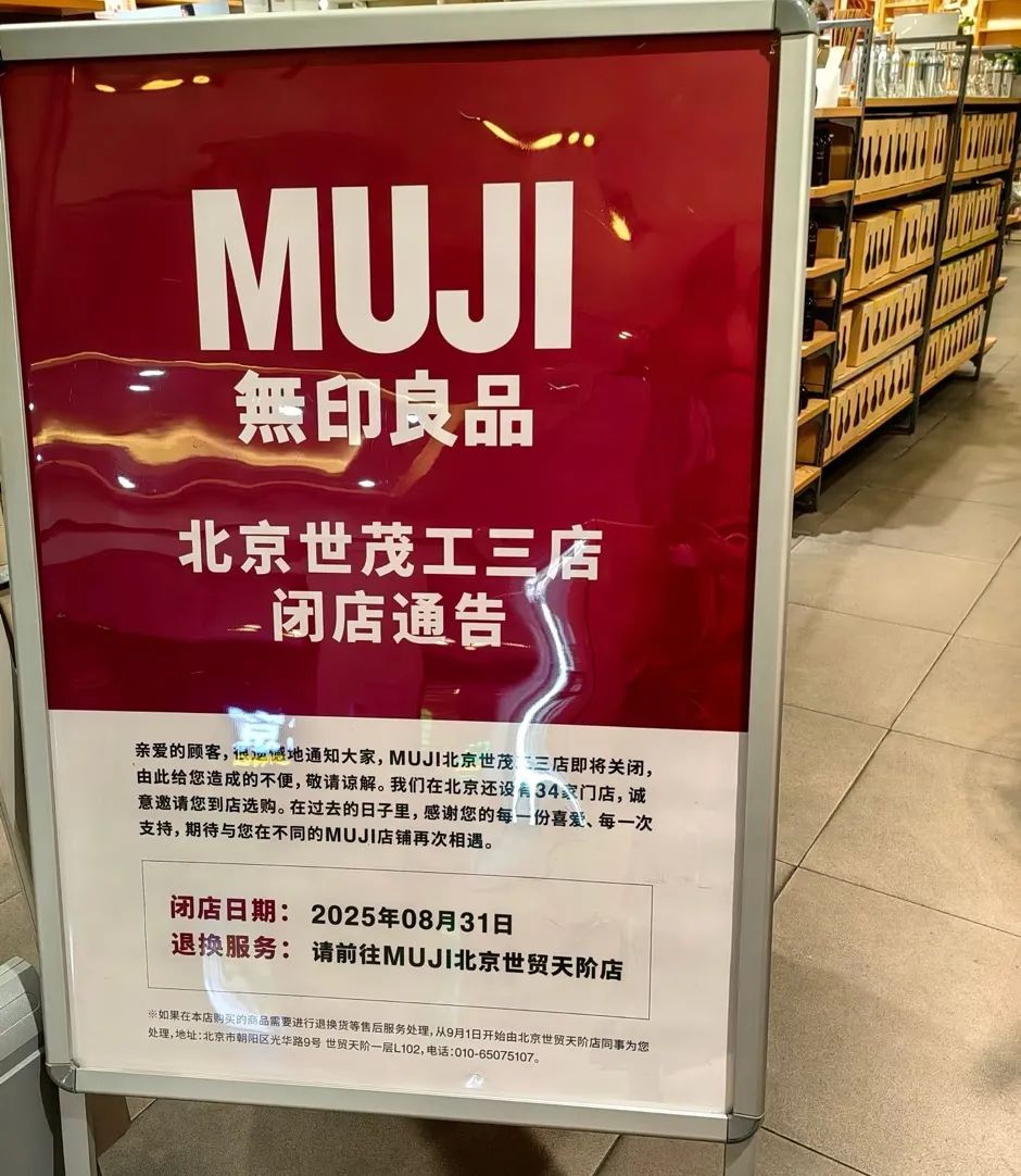 據(jù)媒體報道,北京世茂工三商場內(nèi)的無印良品將在8月31日停止營業(yè)。其通告寫道,退換貨服務(wù)請往MUJI北京世貿(mào)天階店,“很遺憾通知大家,MUJI世茂工三店即將關(guān)閉,由此給您造成的不便,敬請諒解。我們在這個城市還設(shè)有34家門店,誠意邀請您到店選購!