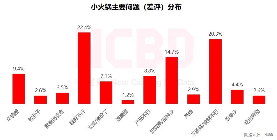 (2)服務差:這是由小火鍋的快餐屬性決定的,在許多消費者眼中小火鍋不屬于快餐,在服務方面會與其他的正餐火鍋對比,因此會給出服務差的印象;