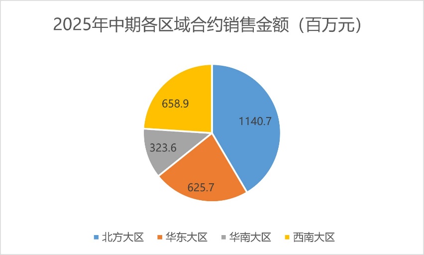 在去年對大區(qū)進行調(diào)整之后,大悅城地產(chǎn)的合約銷售額貢獻來源整合為北方大區(qū)、華東大區(qū)、華南大區(qū)、西南大區(qū)。今年上半年,分別取得合約銷售金額11.41億元、6.26億元、3.24億元、6.59億元,合計達27.49億元,合約銷售面積約16.42萬平方米。