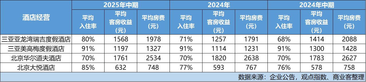 以大悅城地產(chǎn)旗下項目來看,其位于北京的北京華爾道夫酒店在今年上半年的平均入住率為70%,與去年同期持平,但平均客房收益與平均房費均有不同程度下跌。