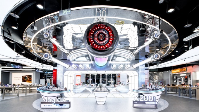 京東電器濟(jì)南泉城路店自2024年底試營(yíng)業(yè)以來,便迅速成為濟(jì)南商業(yè)新地標(biāo),更憑借科技、文化與消費(fèi)深度融合的特色,成為現(xiàn)象級(jí)商業(yè)空間。該店以“空間科技+泉城意象”為核心理念,巧妙將濟(jì)南獨(dú)特的泉水文化與未來零售模式相結(jié)合。在設(shè)計(jì)上,門店打破傳統(tǒng)電器賣場(chǎng)的陳列邏輯,運(yùn)用流線型展陳、鏡面天花板、數(shù)字光影及互動(dòng)屏幕等元素,生動(dòng)還原“清泉石上流”“明湖月色”等濟(jì)南特色景致,構(gòu)建起上萬(wàn)平方米的沉浸式場(chǎng)景集群。這一設(shè)計(jì)不僅重新定義了電器零售的環(huán)境體驗(yàn),更成功將地方文化符號(hào)轉(zhuǎn)化為可感知、可互動(dòng)的當(dāng)代設(shè)計(jì)語(yǔ)言,讓消費(fèi)者在購(gòu)物中感受文化魅力。