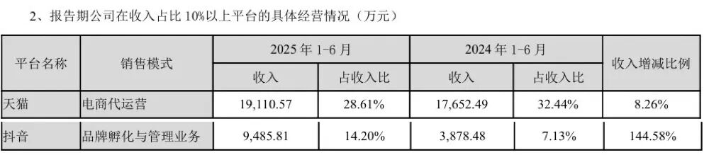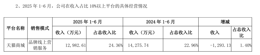 壹網(wǎng)壹創(chuàng)在2025上半年,天貓商城平臺的品牌線上營銷服務(wù)收入減少,不過占總收入比重小幅提升。
