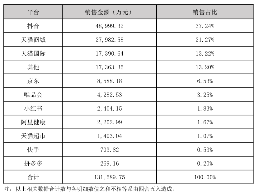 值得一提的是,在報告期內(nèi),抖音已成為若羽臣第一大銷售渠道,銷售金額為4.90億元,銷售占比37.24%,超過天貓商城和天貓國際銷售金額總和?梢,若羽臣在渠道方面轉(zhuǎn)型奏效。