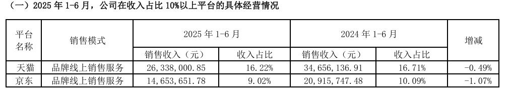 凱淳股份在天貓平臺中,品牌線上銷售服務(wù)收入為0.263億元,占比16.22%;在京東銷售收入額為0.147億元,占比9.02%。值得注意的是,兩者占比均較去年同期有所下降。