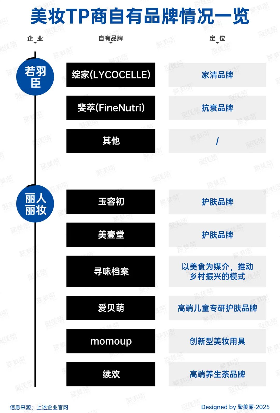 從自有品牌布局來看,目前7大主要美妝TP商中,僅若羽臣與麗人麗妝兩家明確拓展自有品牌板塊。