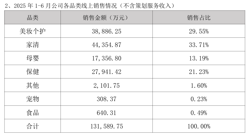 除優(yōu)趣匯外,若羽臣也在美妝個護品類中取得積極進展。在報告期內(nèi),若羽臣的美妝個護品類在線上銷售達3.89億元,銷售額占比29.55%,僅次于家清,位列若羽臣線上銷售第二大品類。
