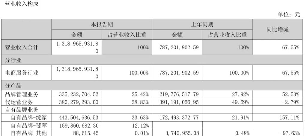若羽臣在財報中透露,報告期內(nèi)其自有品牌業(yè)務(wù)占比45.77%,已遠超代運營業(yè)務(wù)(占比28.83%)。上半年實現(xiàn)營收6.03億元,同比增長242.42%。其中,綻家實現(xiàn)營收4.44億元,同比增長157.11%,618大促期間全渠道GMV同比增長超160%;斐萃在今年上半年營收1.60億元,在618大促期間,全渠道GMV較去年雙十一期間增長2000%。