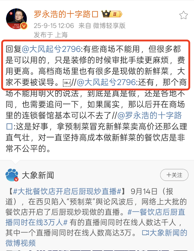 先看羅永浩的回答,他對(duì)網(wǎng)友進(jìn)行了科普:“有些商場(chǎng)不能用,但很多都是可以用的,只是裝修的時(shí)候?qū)徟掷m(xù)更麻煩,費(fèi)用更高。高檔商場(chǎng)里也有很多是現(xiàn)做的新鮮菜”。