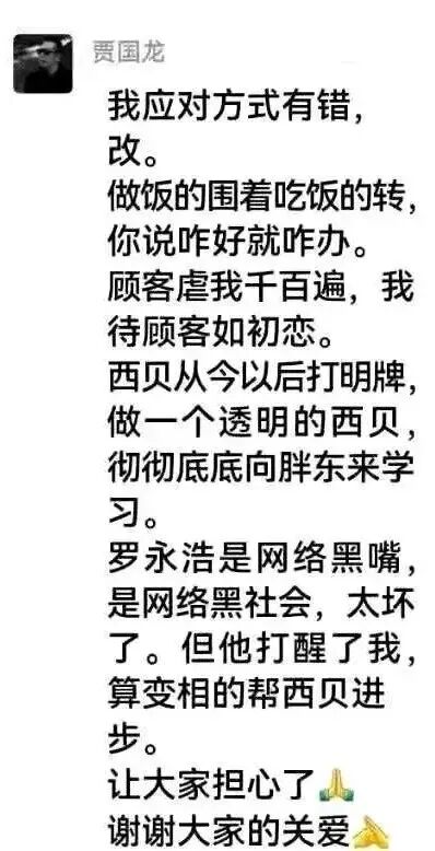 9月14日,一張關(guān)于西貝賈國龍?jiān)谀硞行業(yè)群內(nèi)的表態(tài)截圖流出,他誠懇地道歉:“我應(yīng)對方式有錯,改。做飯的圍著吃飯的轉(zhuǎn),你說咋好就咋辦。顧客虐我千百遍,我待顧客如初戀。”