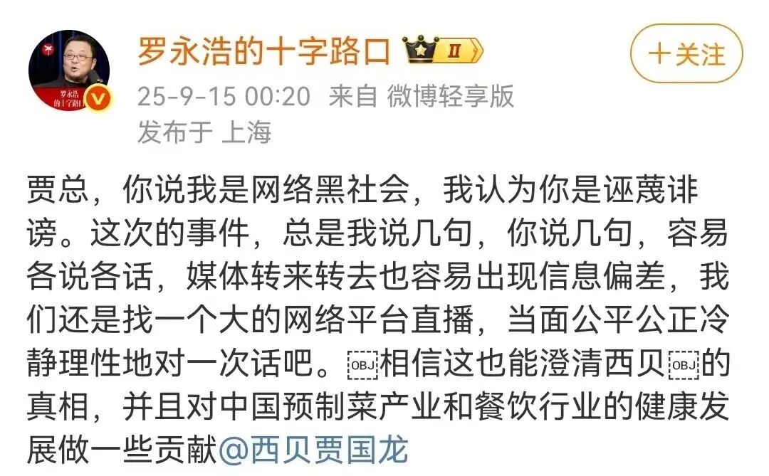 9月15日凌晨,睡不著的羅永浩再度發(fā)博,希望跟西貝賈國龍來一次公平公正的面對面直播對話,避免雙方接收到的信息在層層傳遞中出現(xiàn)偏差或失真。