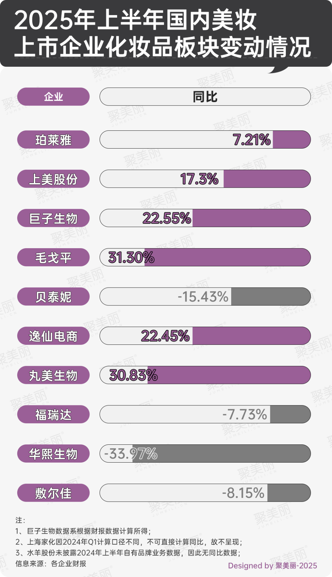 聚焦頭部國(guó)貨美妝來(lái)看,聚美麗此前統(tǒng)計(jì)了2025年上半年國(guó)內(nèi)美妝上市企業(yè)TOP榜(詳見(jiàn)),其中,在化妝品板塊,6家呈增長(zhǎng),4家呈下滑。