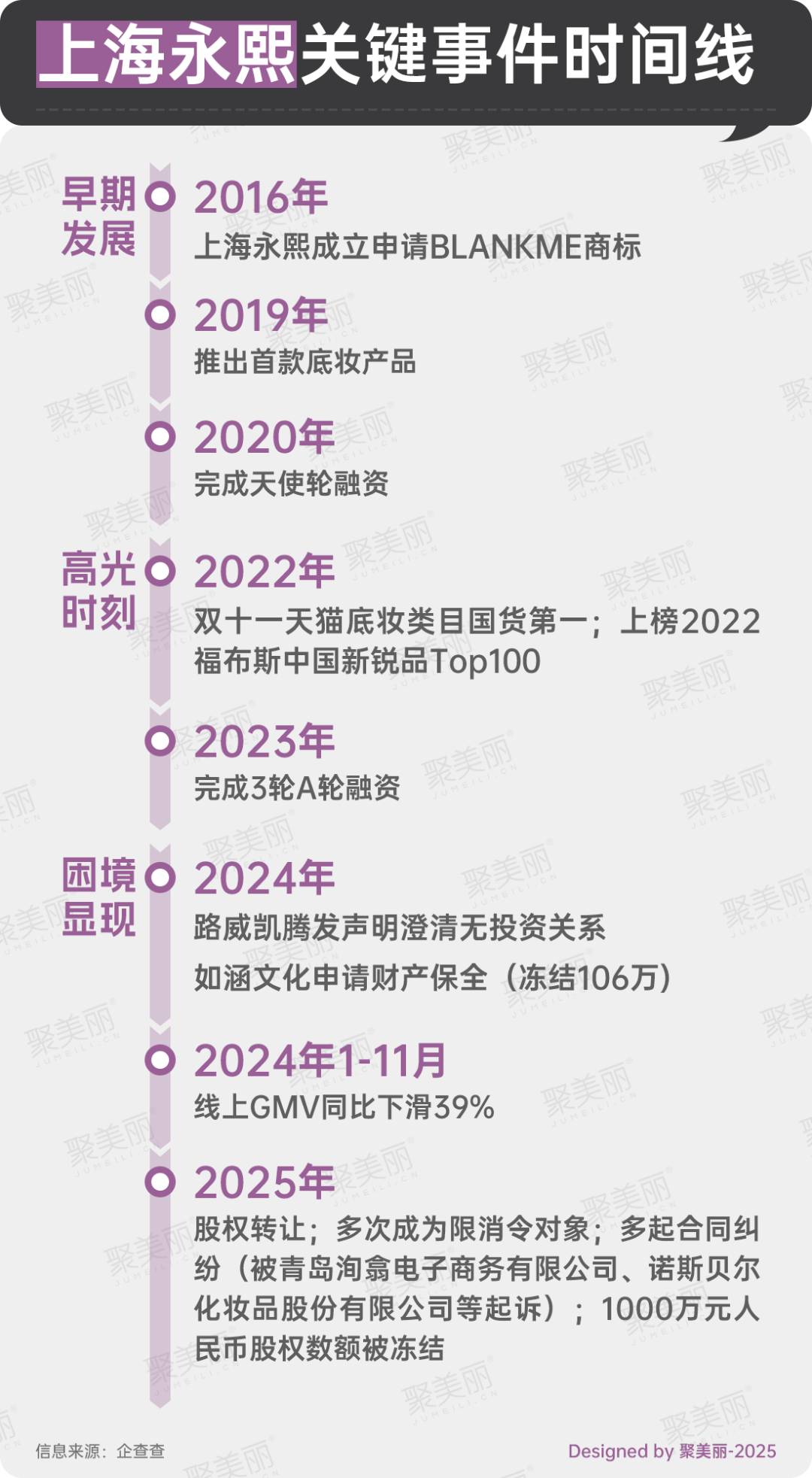 如華熙生物旗下新銳護(hù)膚品牌潤(rùn)熙泉被爆疑似閉店,再如,曾經(jīng)是“國(guó)貨底妝第一”的新銳品牌blankme半分一,其母公司上海永熙信息科技有限公司(以下簡(jiǎn)稱(chēng):上海永熙),面臨多重債務(wù)危機(jī)纏身,作為被告共涉及17起開(kāi)庭公告,其中11次被列為被執(zhí)行人,被執(zhí)行總金額高達(dá)1241.44萬(wàn)元。
