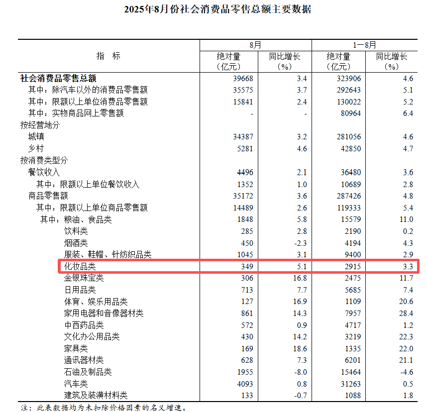 9月15日,國(guó)家統(tǒng)計(jì)局發(fā)布了今年8月、1-8月的社零數(shù)據(jù),按消費(fèi)類(lèi)型分,8月、1-8月化妝品類(lèi)零售額分別為349億元、2915億元,分別同比增長(zhǎng)5.1%、3.3%。且值得注意的是,單月化妝品類(lèi)零售額同比增長(zhǎng)跑贏了社零大盤(pán)。