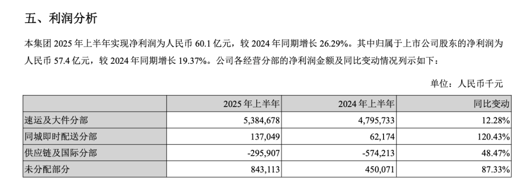 2025年上半年,順豐速運及大件分部實現(xiàn)凈利潤53.85億元,排在其他分部前面;同城即時配送分部實現(xiàn)凈利潤1.37億元,同比增長120.43%;供應(yīng)鏈及國際分部在營收同比增長8.67%的情況,卻依然沒有實現(xiàn)盈利,虧損2.96億元。