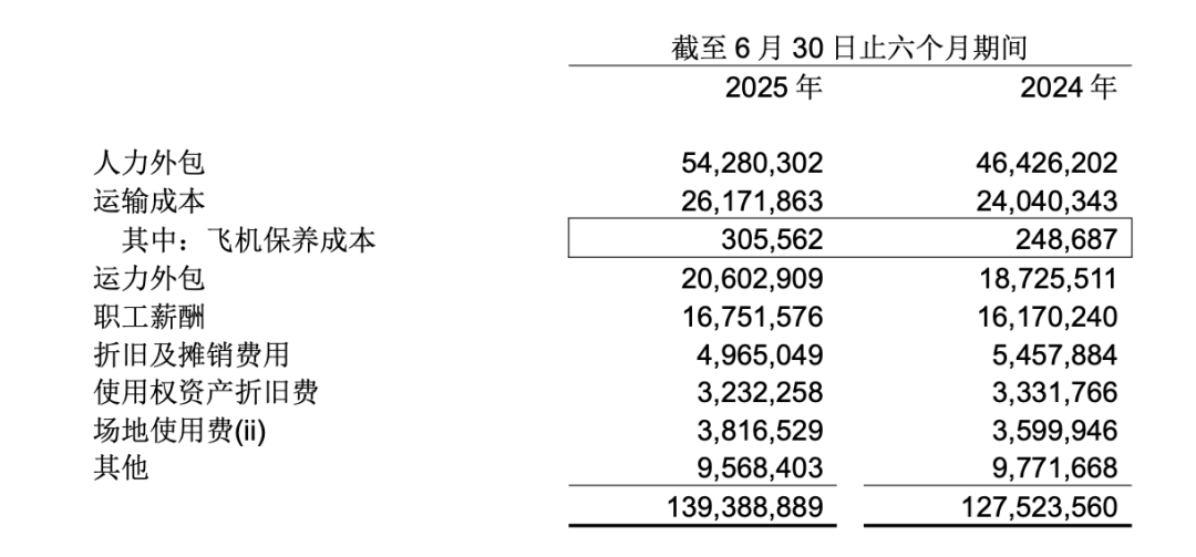 2025年上半年,順豐的人力外包成本增長至542.80億元,運力外包成本增長至206.03億元,共計748.83億元。這期間,順豐的營業(yè)成本為1274.48億元,同比增長10.07%,在總營收中的占比為86.78%。