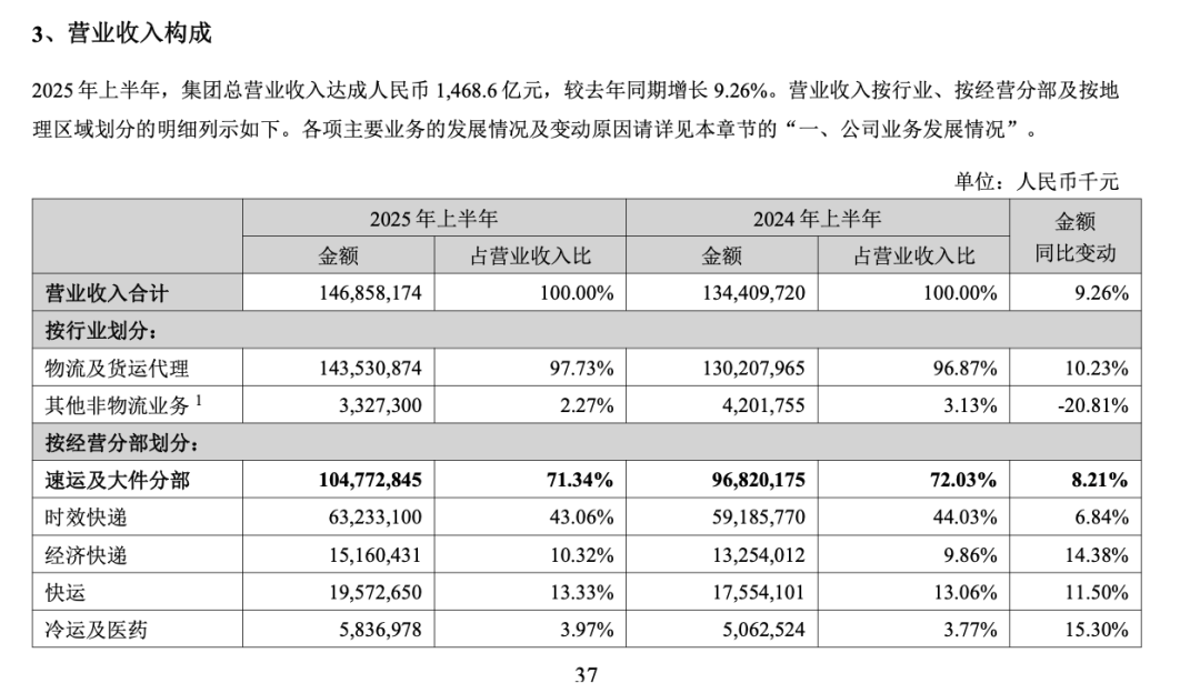 2025年上半年,順豐時效快遞營收為632.33億元,同比增長6.84%,在總營收的占比達到44.03%。
